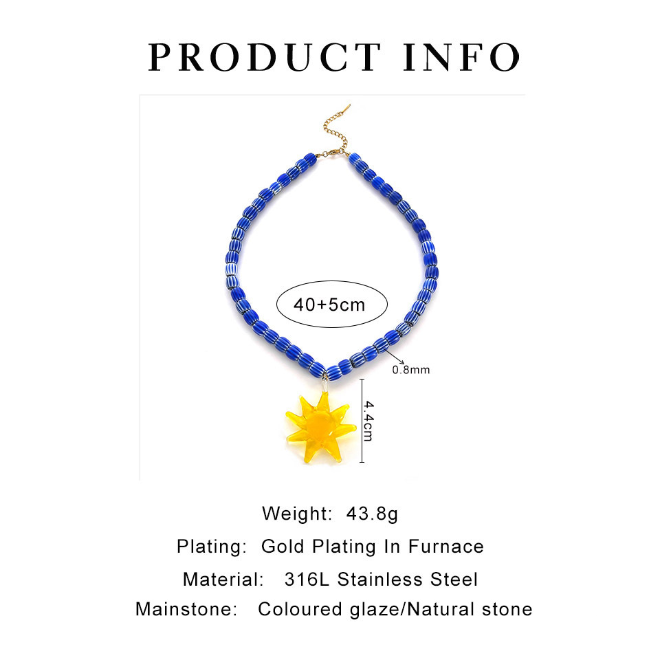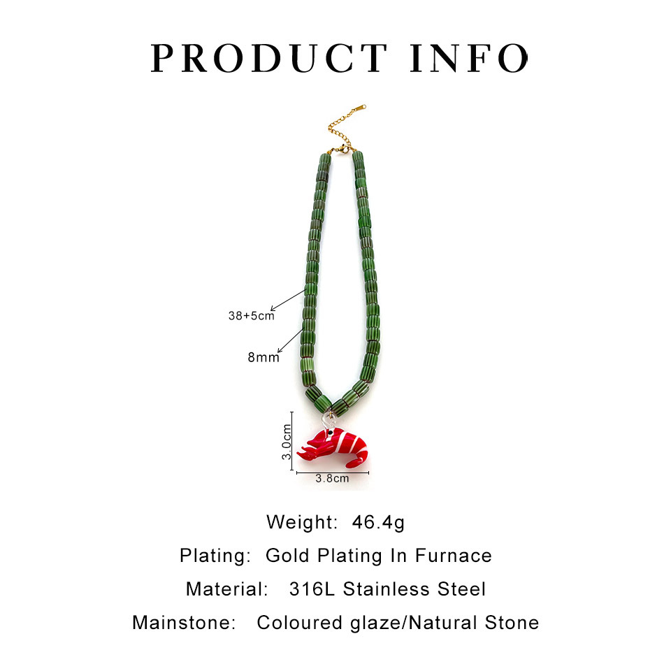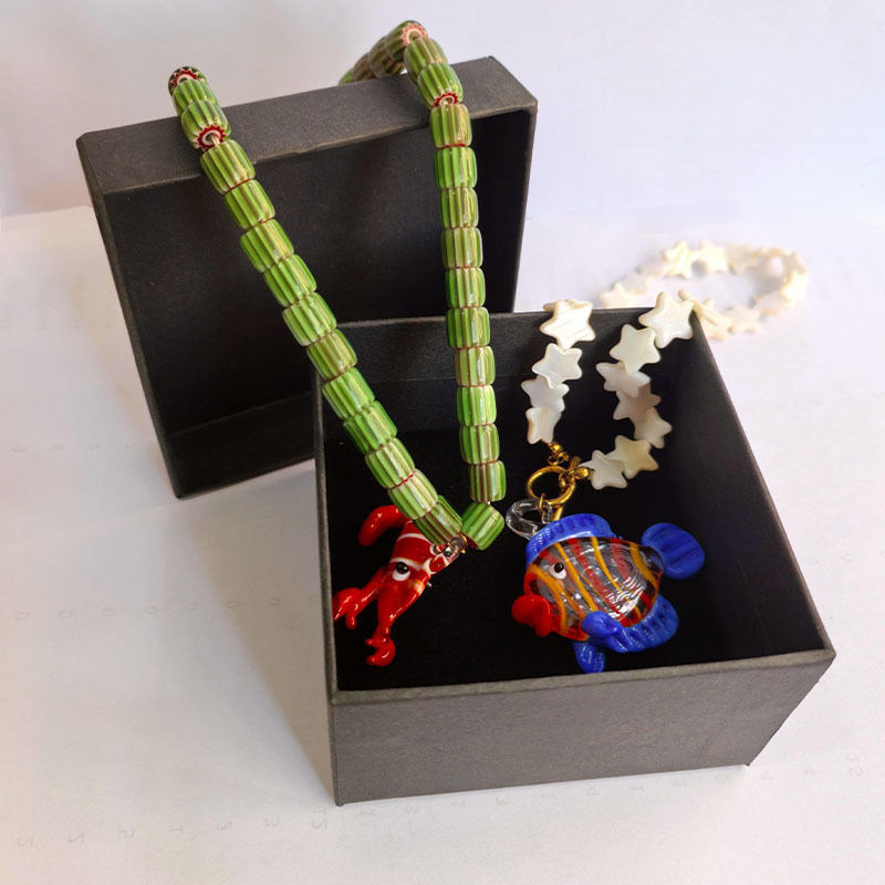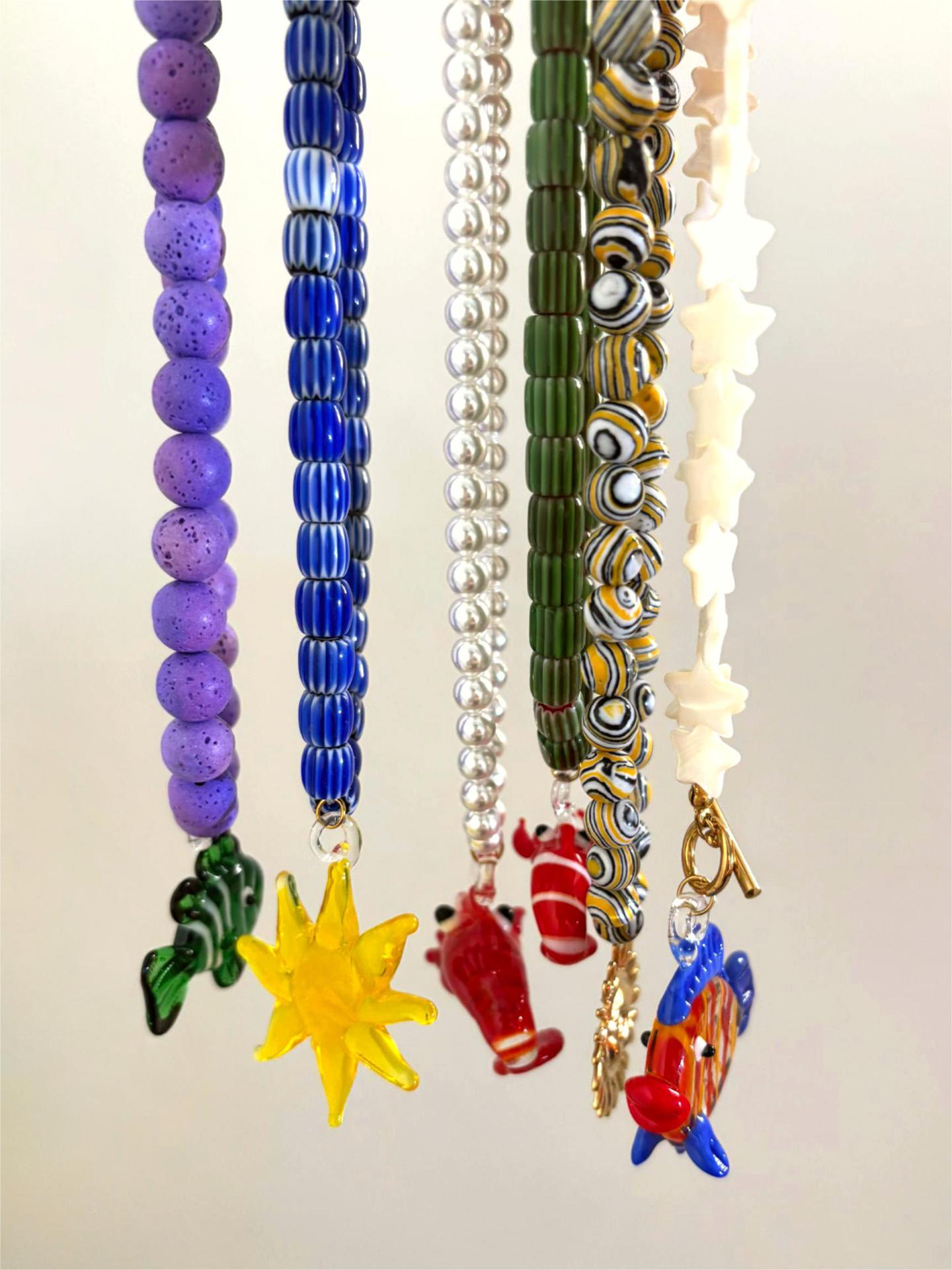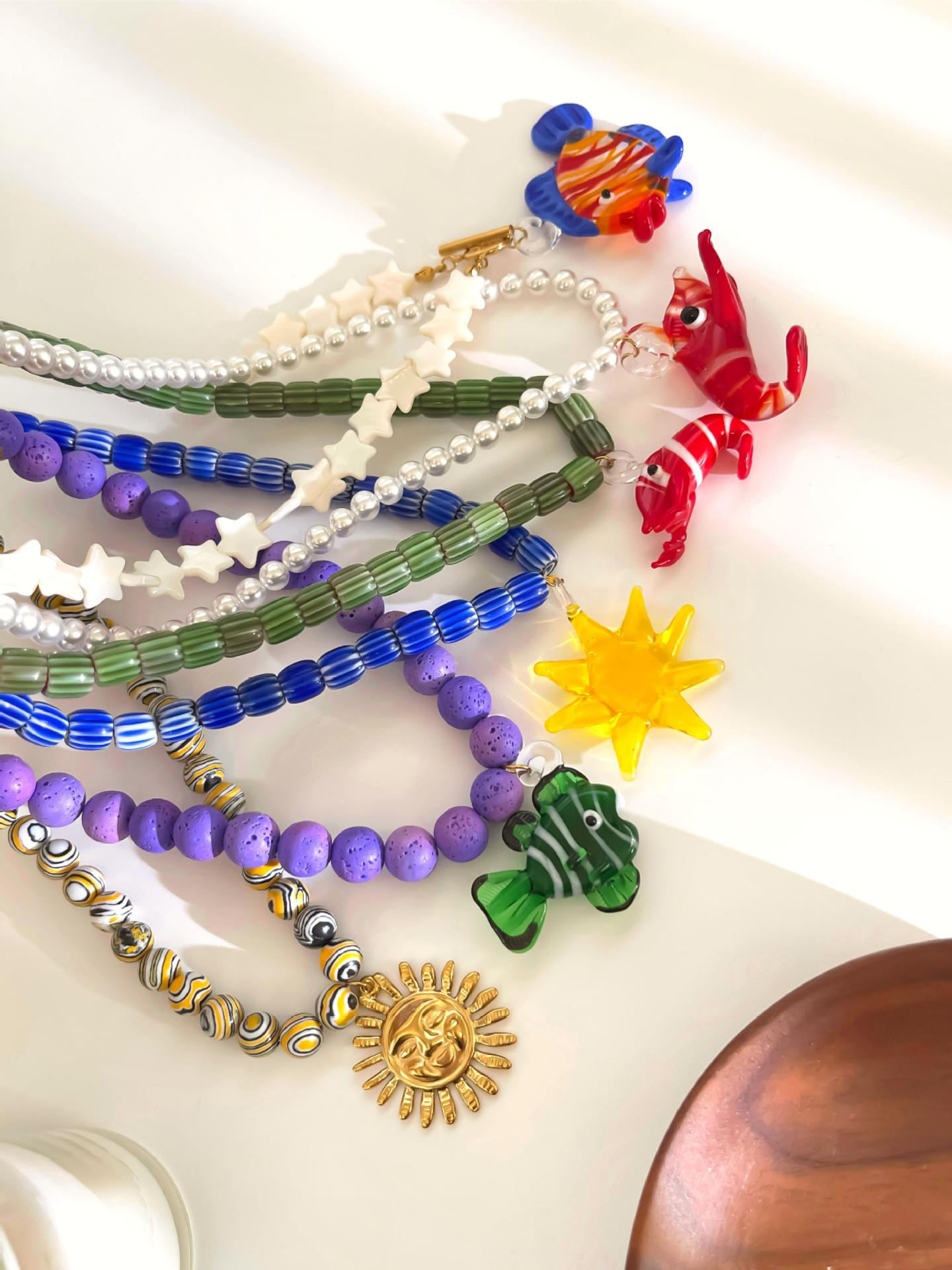 Color: green printing beads red lobster necklace (packing box), five-pointed star shell red and blue fish necklace (packing box), round pattern beads Gold Sun Necklace (packing box), round PEARLRED lobster necklace (packing box), blue beads Yellow Sun Necklace (packing box)