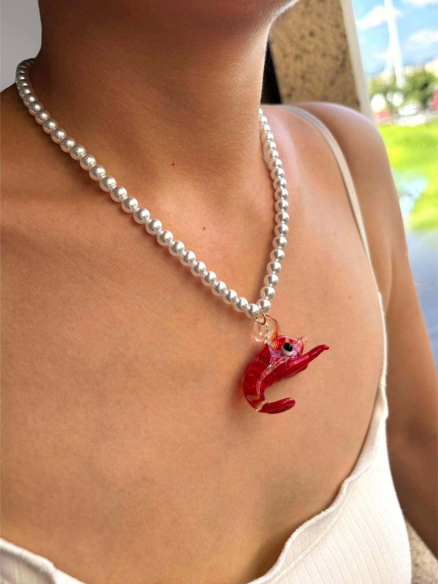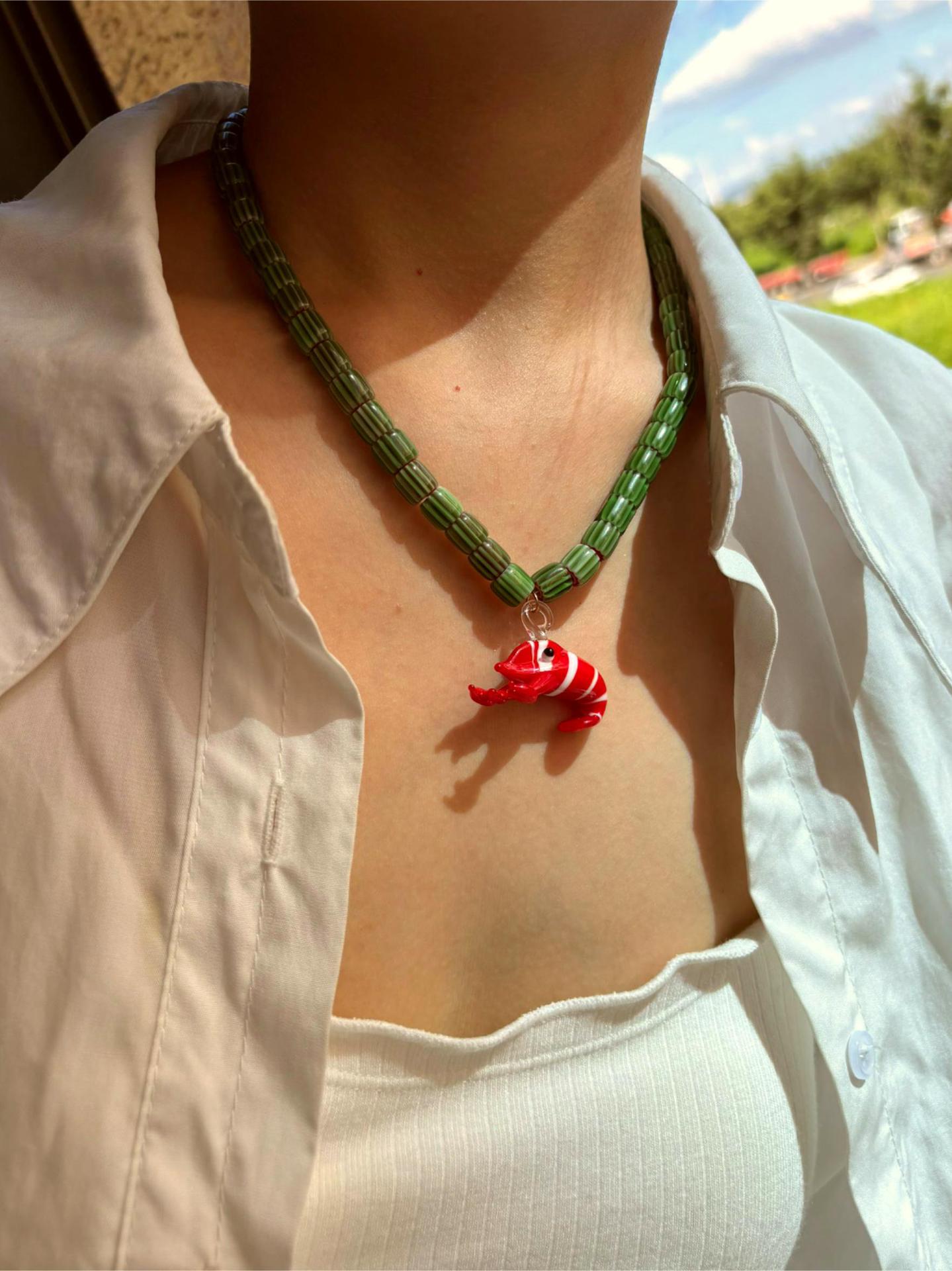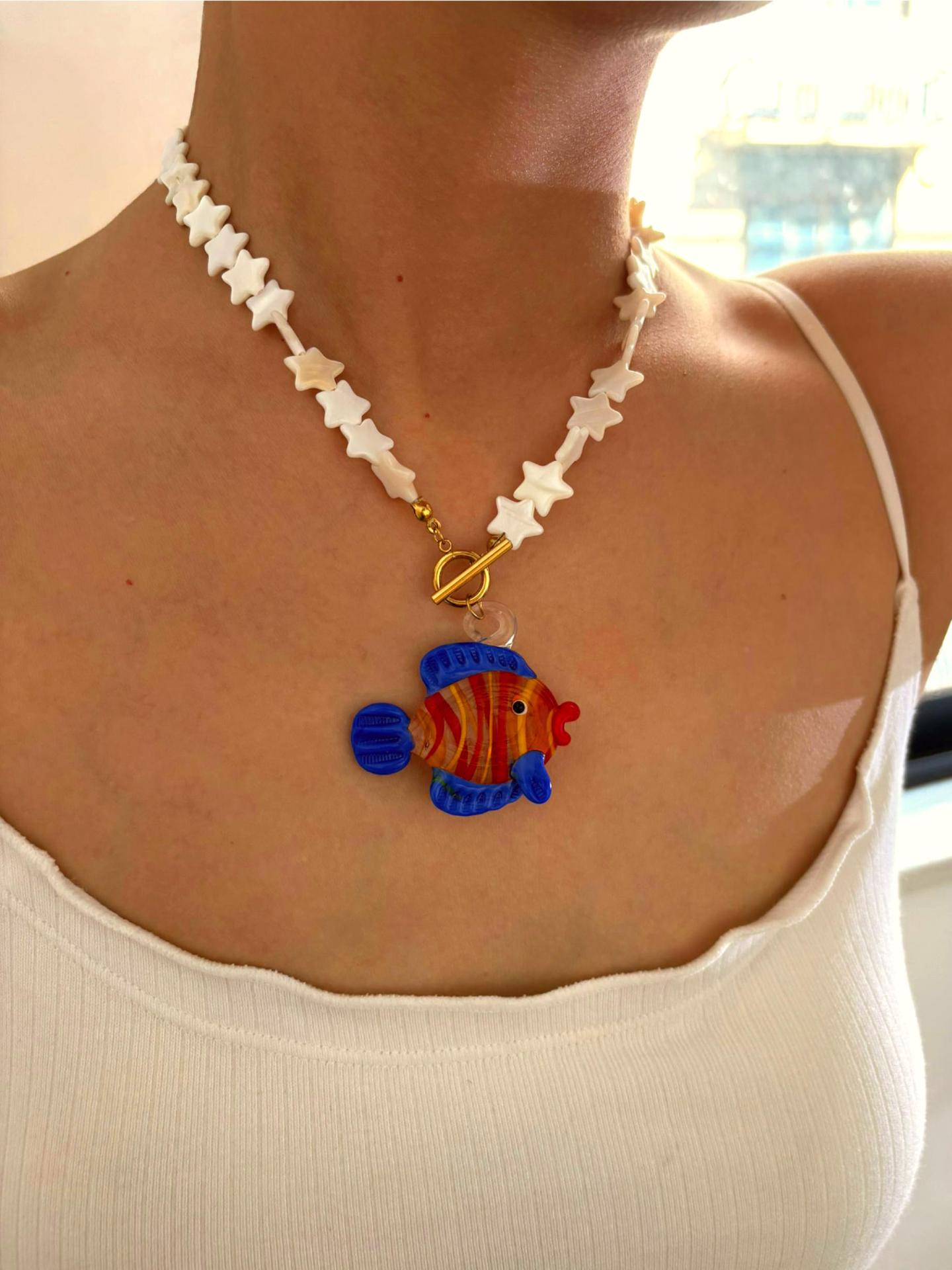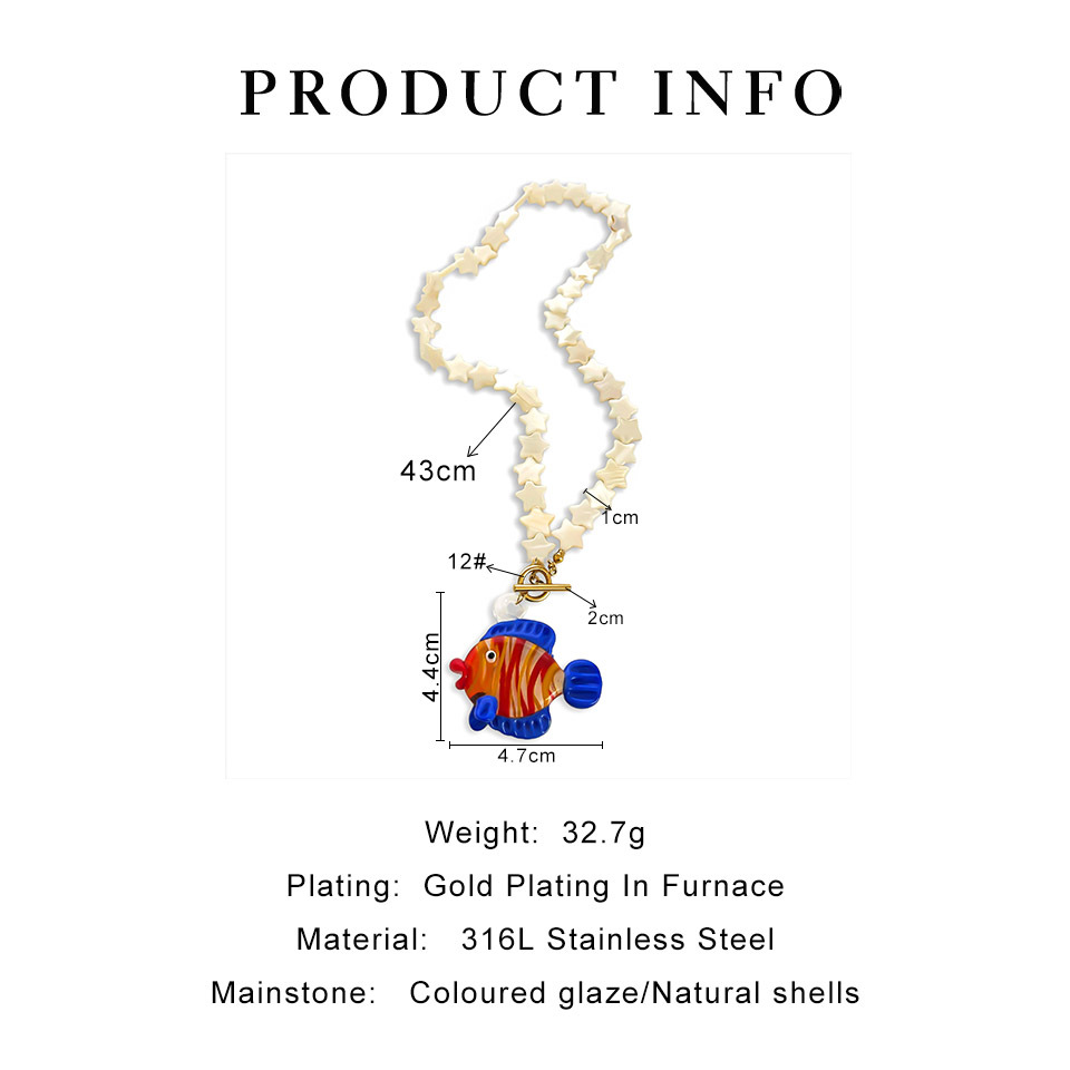 Color: green printing beads red lobster necklace (packing box), five-pointed star shell red and blue fish necklace (packing box), round pattern beads Gold Sun Necklace (packing box), round PEARLRED lobster necklace (packing box), blue beads Yellow Sun Necklace (packing box)