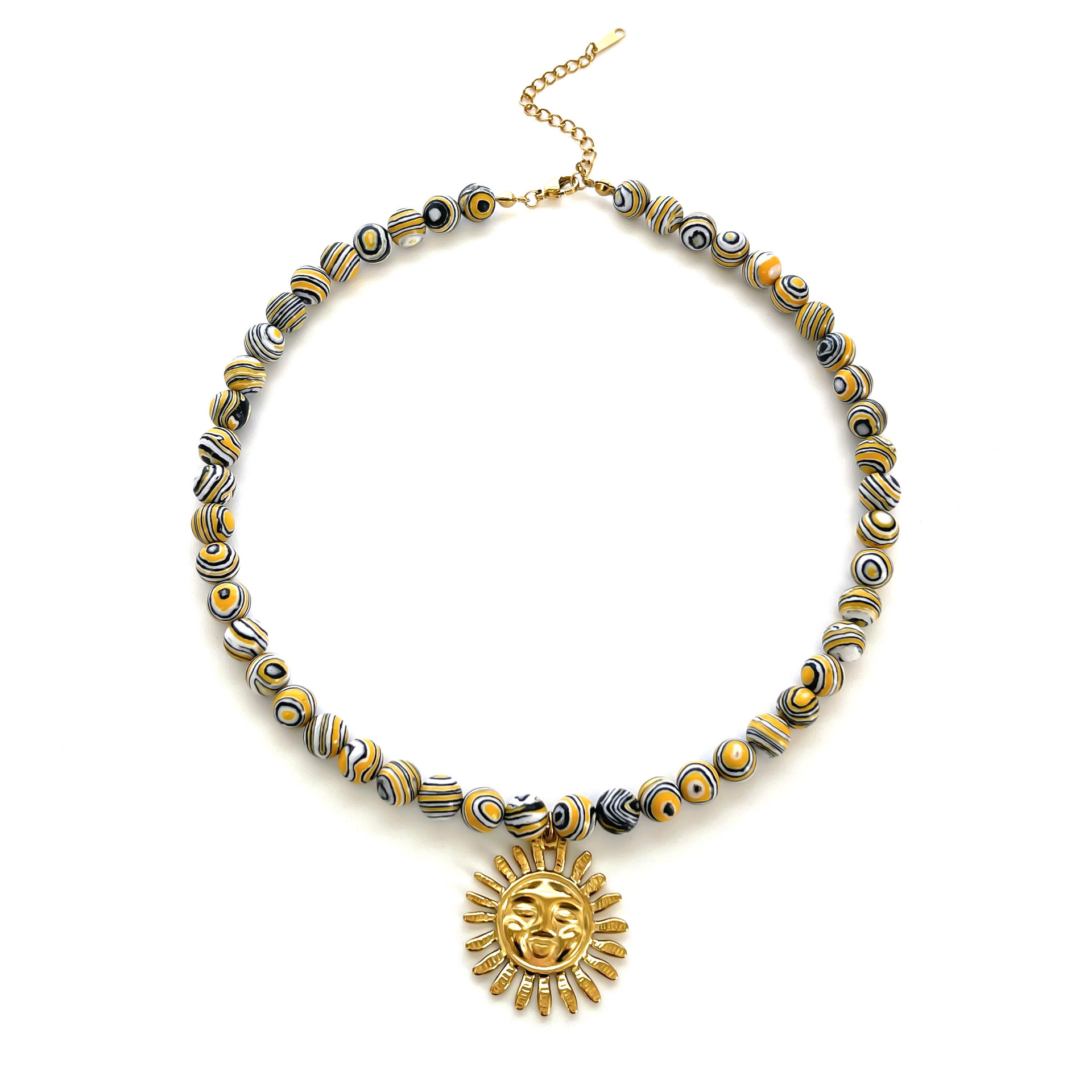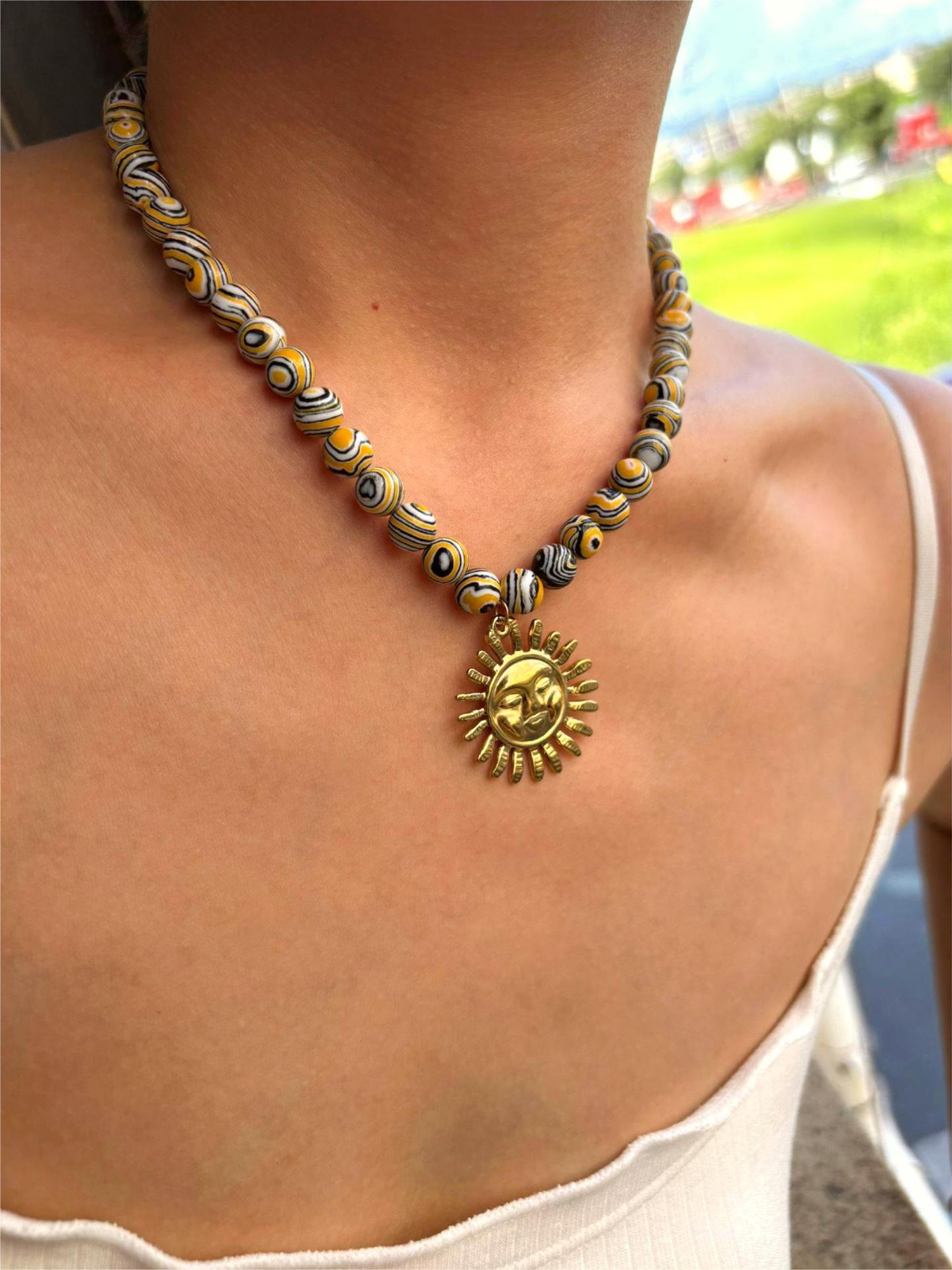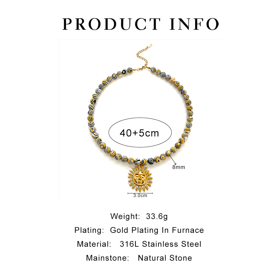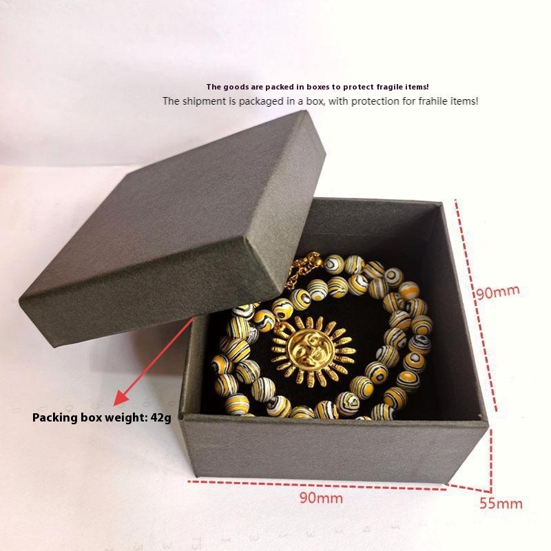 Color: green printing beads red lobster necklace (packing box), five-pointed star shell red and blue fish necklace (packing box), round pattern beads Gold Sun Necklace (packing box), round PEARLRED lobster necklace (packing box), blue beads Yellow Sun Necklace (packing box)