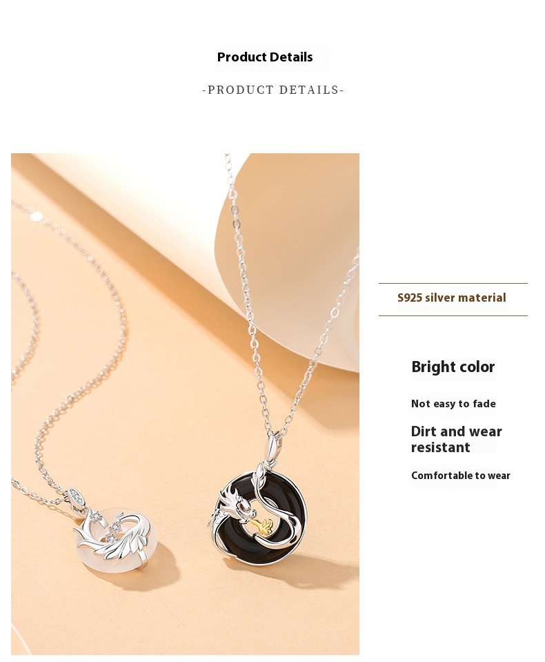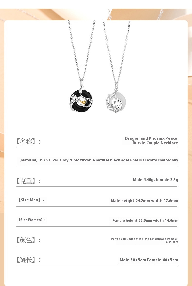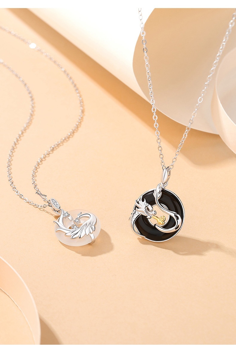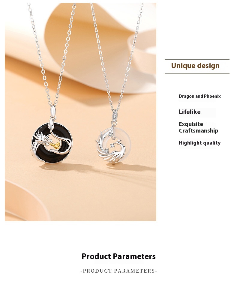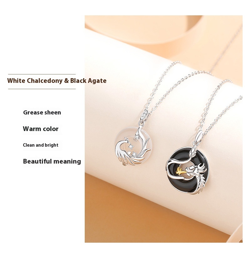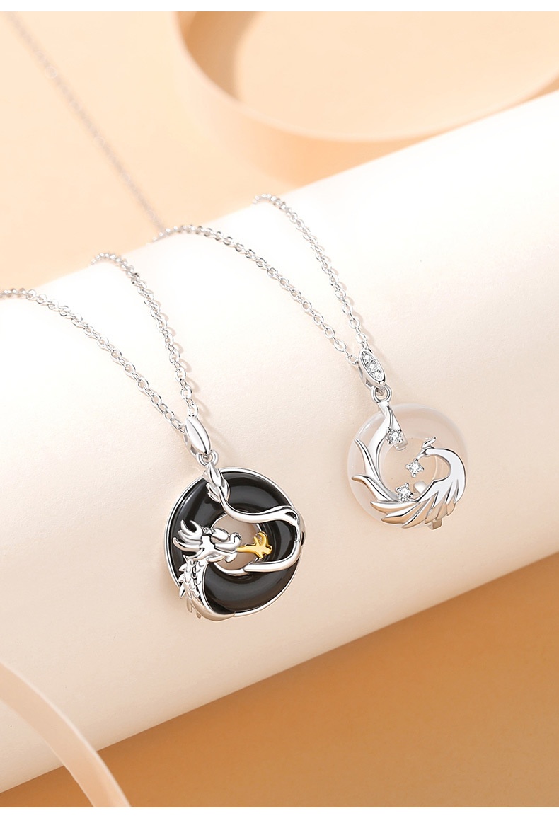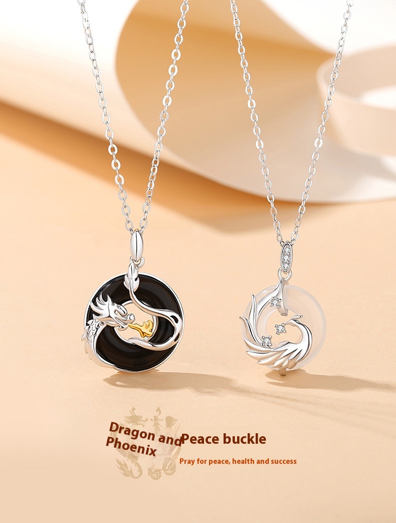 Color: Dragon and flat buckle couple necklace men black agate, Phoenix peace buckle couple necklace women white chalcedony, Dragon Hetian jade couple necklace men, Phoenix peace buckle Hetian jade couple necklace women